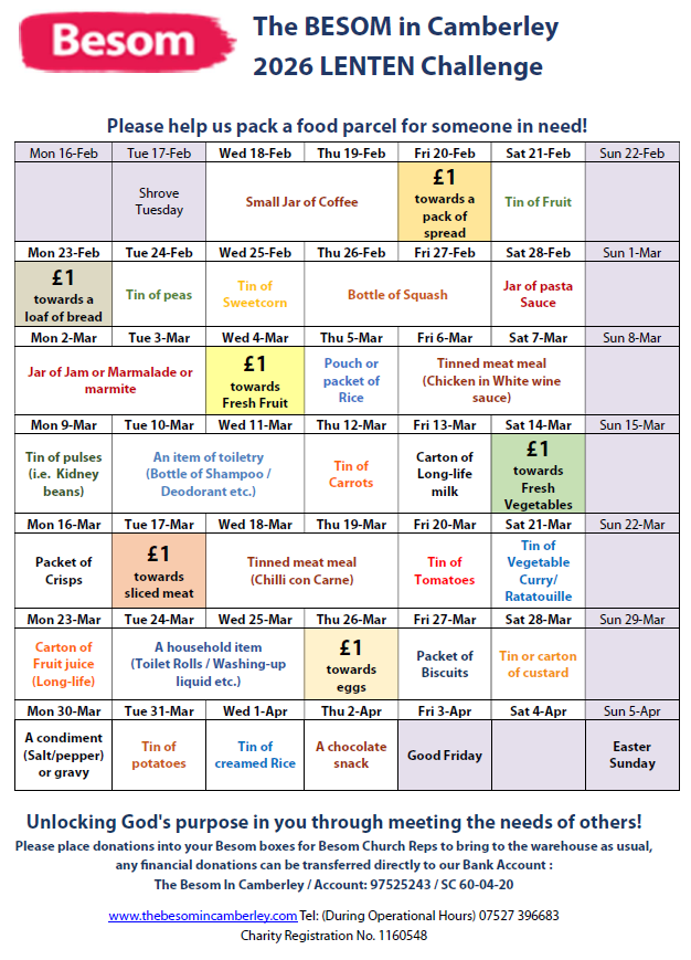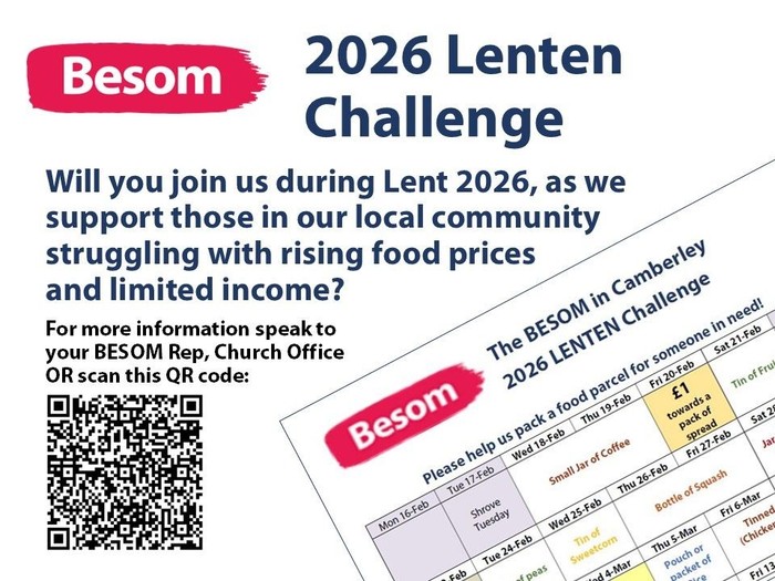Please consider doing the Besom's Lenten challenge, where you put something aside for the Besom every day during Lent. Printed challenges are available at the back of church, or you can request more from the office, or you can click here to download it yourself and print at home.