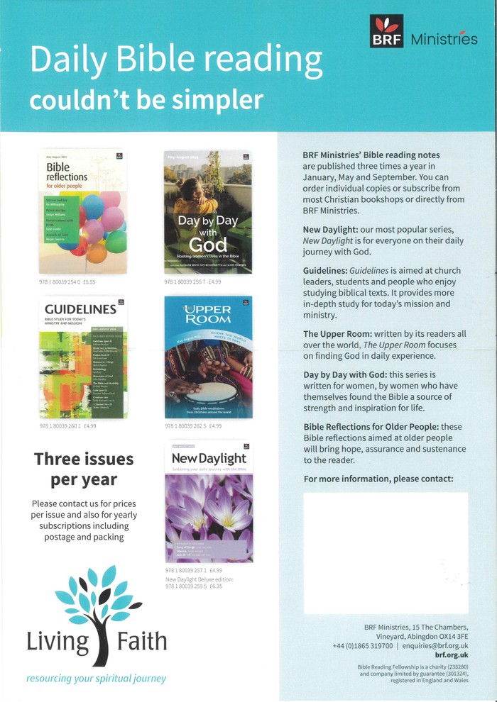 Would you be interested in a subscription to the one of the publications from BRF Ministries? The publications come three times a year and are just £5.25 each. Carolyn receives them all in and then distributes them for us, so postage is free. You can ask her if you would like to browse some previous samples. Popular titles include: