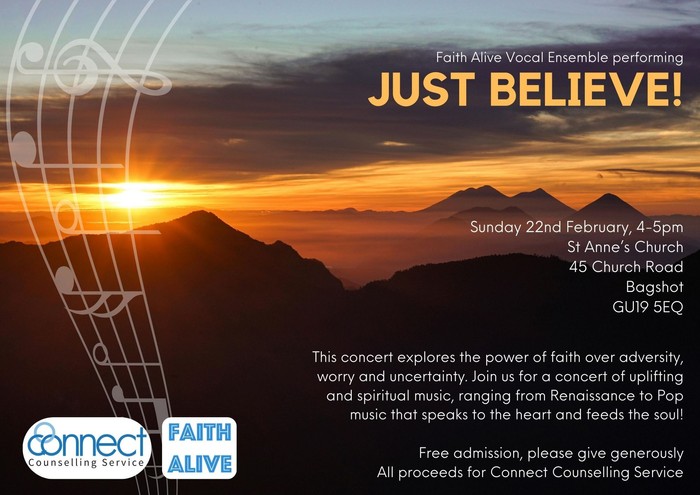 We are so pleased to announce that we have a fundraising concert for Connect counselling on Sunday 22nd Feb, from the wonderful vocal group Faith Alive. It is FREE to attend, but we encourage you to dig deep for this great cause. Please share with friends and family. Refreshments will be available.