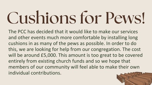 We hope that you will feel able to participate in this project. We look forward to our pews becoming more comfortable and welcoming.