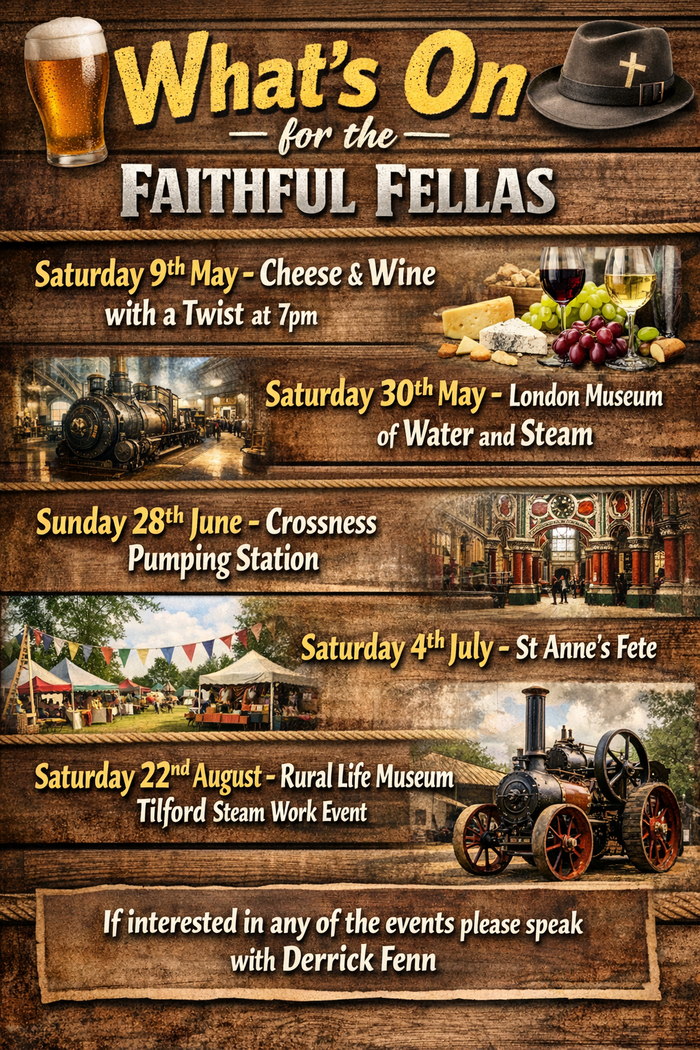 The next Faithful Fellas Breakfast Club will be Saturday 11th April in the church centre. Usual time - 8.30am for coffee and a chat with breakfast at 9.00am.