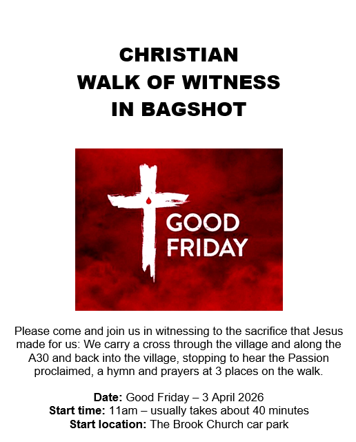 As in previous years, we are planning to do our Good Friday walk of witness around Bagshot, along with the other churches of Bagshot. The walk takes around 40 minutes and starts at 11am in the centre of the village. Please do join us!
